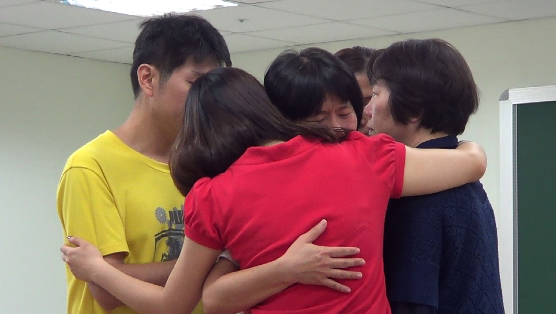 在移動的過程中,我們加入母親的代表,當事人接受母親原原本本的樣貌後,原本垂彎的身體可以慢慢挺起來;心的代表也慢慢過來支持身體;靈的代表原本是前後晃動,然後能夠慢慢地穩定下來。加入父親的代表後,靈的代表看向父親,接著兩者都慢慢移動朝向母親、身體和心三位代表之群組,最後五位代表環抱合一…